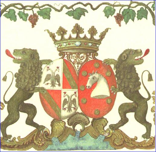 2) De gueules à la tête de cheval d'argent accompagnée de huit roses d'or ordonnées en orle.