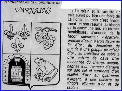 Écartelé: au 1er d'azur à trois fleurs de lis d'or, au 2e de gueules à la grappe de raisin feuillée d'or, au 3e de sable à l'entrée de cave d'or, maçonnée et ouverte du champ, l'ouverture chargée d'un tonneau d'argent sur son cul et surmonté d'un maillet d'or, au 4e d'argent à la rainette de sinople allumée d'or et de sable.