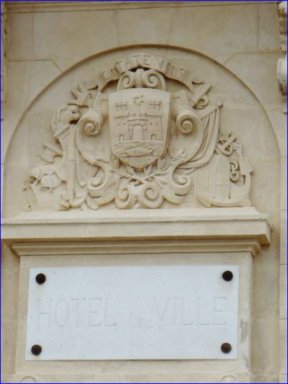 D’azur, à une ville d’argent en fasce, soutenue d’une mer du même, la ville sommée d’une crosse d’or, adestrée d’un C et senestrée d’un T d’argent, et au milieu de la mer, une barque de sable, les voiles pliées».