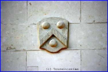 De gueules au chevron d'argent accompagné de trois besants d'or.