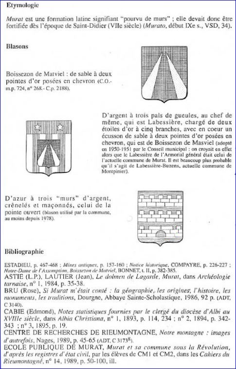 Le blason présenté est formé du blason de Labessière-Candeil (commune du Tarn) auquel a été rajouté Les armes de Boissezon de Masviel. C'est une très grosse erreur que de confondre "Labessière" et "Labessière -Candeil" qui n'ont strictement aucune relation entre elles. Le conseil municipal de Murat sur vèbre a par contre fait établir un blason en 1956 pour représenter la commune de Murat et qui sont ainsi décrites: