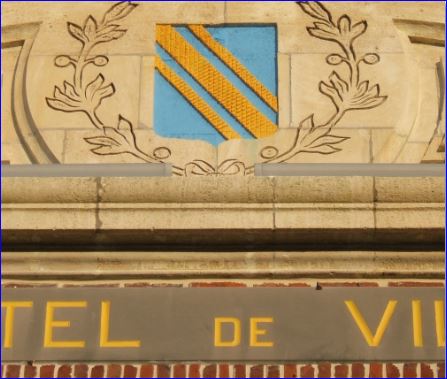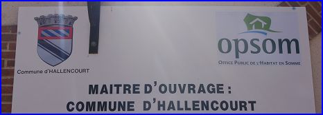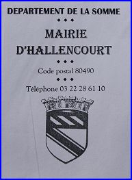 Armes de la commune d'Hallencourt sous leur forme initiale (début du XXe siècle) au fronton de la mairie, sans le chef de Ponthieu qui s'est ajouté aux armes actuelles. Elles ont été hélas repeintes avec des couleurs fautives il y a quelques années.
