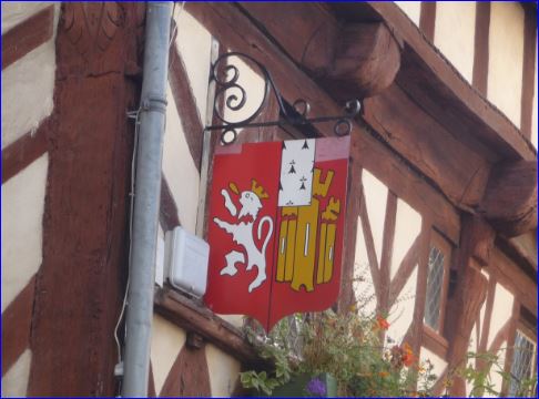 Parti: au 1er de gueules au lion d'argent couronné d'or, au 2e de gueules au château de trois tours d'or, ajouré de sable et au franc-canton d'hermine.
