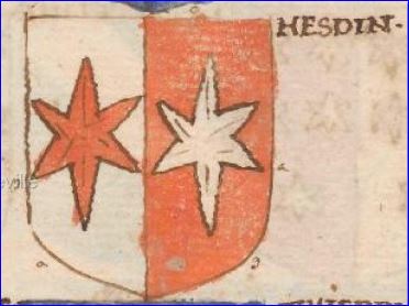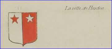 (1700) Parti d'argent et de gueules, à deux étoiles de l'un en l'autre rangées en chef.