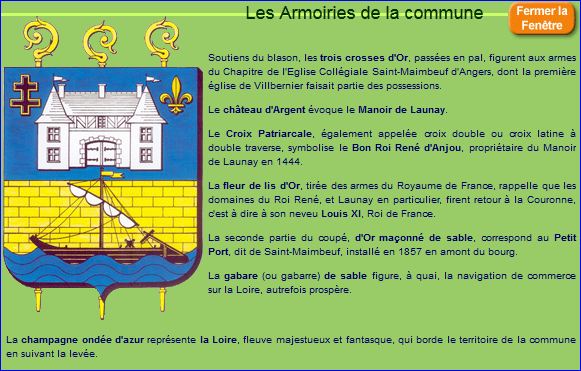 Coupé: au 1er d'azur au château du lieu d'argent accosté en chef d'une croix patriarcale de sable bordée d'or à dextre et d'une fleur de lis du même à senestre, au 2e d'or maçonné de sable, à la gabarre de sable, les voiles ferlées d'argent, pavillonnée d'or, voguant sur des ondes d'azur et brochant sur le tout.