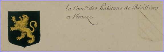(2024) D'azur à la barre cousue de gueules, au lion d'or surmonté de l'inscription « BAVILLIERS » en lettres capitales d'argent et soutenu d'une fleur de lis du même, le tout brochant sur la barre; à la filière cousue de gueules.