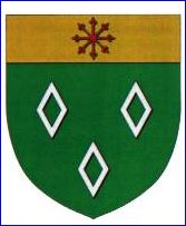 De sinople à trois mâcles d'argent; au chef d'or chargé d'une escarboucle fleurdelisée de gueules.