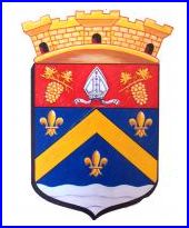 D'azur au chevron d'or, accompagné de trois fleurs de lis du même et soutenu d'ondes d'argent mouvant de la pointe; au chef de gueules chargé d'une mitre d'argent, accostée de deux grappes de raisin tigées et feuillées d'or.