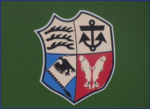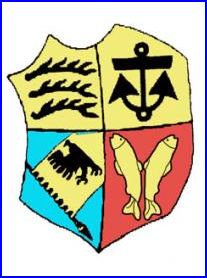 Écartelé: au 1er d'or à trois demi-ramures de sable, posées en fasce et rangées en pal, au 2e d'or à l'ancre de sable, au 3e d'azur à la bannière d'or, posée en barre et chargée d'une demie aigle bicéphale de sable, faillie à senestre, à la hampe du même posée en bande, au 4e de gueules à deux bars adossés d'or.