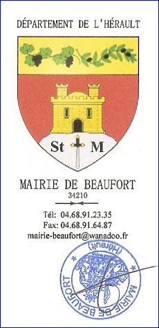 (v. 1980) De gueules à la tour couverte en croupe donjonnée de deux pièces, le tout d'or, maçonnée, ouverte et ajourée de sable, posée sur une colline d'argent chargée d'un glaive abaissé du même, garni de sable et pommeté d'or, accosté des lettres de sable "St" à dextre et "M" à senestre; au chef d'or chargé de deux rinceaux fruités de sable et feuillés de sinople adossés en fasce, celui de dextre de vigne et celui de senestre d'olivier.