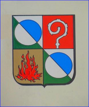 (Années 90) Écartelé: aux 1er et 4e tranché d'argent et de sinople au tourteau-besant tranché d'azur et d'argent brochant sur la partition, au 2e de gueules à la crosse d'argent mouvant de la pointe, au 3e d'or au feu allumé de gueules.