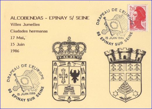 (1942) Coupé: au 1er d'or à la croix de gueules, cantonnée de seize alérions d'azur; au 2e d'argent au pin arraché de sinople, accosté de deux étoiles de six rais de gueules.