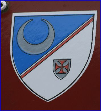 Taillé: au 1er d'azur au croissant d'argent, au 2e d'argent à l'écusson du champ chargé d'une croisette pattée de gueules, surmonté d'un filet en barre de gueules.