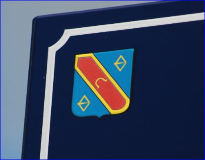 D'azur à la bande d'or remplie de gueules, chargée d'une agrafe d'or et accompagnée de deux fermaux du même.