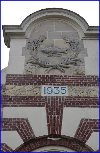 Le motif sculpté au fronton de la salle communale a directement inspiré le blason communal.