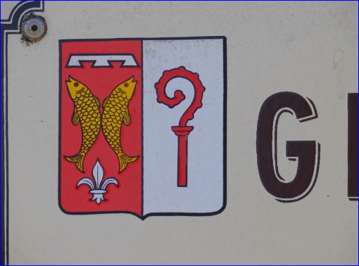 Parti: au 1er de gueules à deux poissons adossés d'or, surmontés d'un lambel d'argent et soutenus d'une fleur de lis du même, au 2e d'argent à la crosse de gueules.