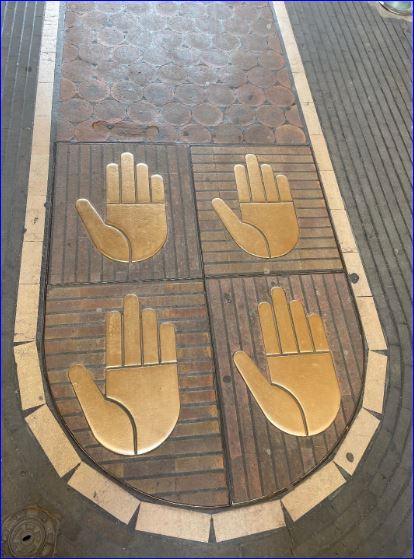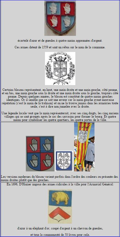 (XVe s.) Écartelé d'azur et de gueules, chaque quartier chargé d'une main senestre appaumée d'argent.