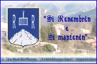 D'azur au mont escarpé mouvant de la pointe, surmonté d'un gril la poignée en chef accosté de deux lettres capitales R, le tout d'argent.