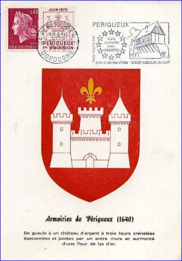 (1640) De gueules au château de deux tours pavillonnées d'argent, donjonné du même, maçonné de sable, surmonté d'une fleur de lis d'or.