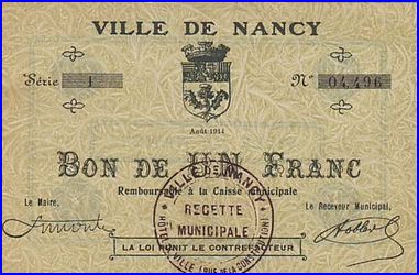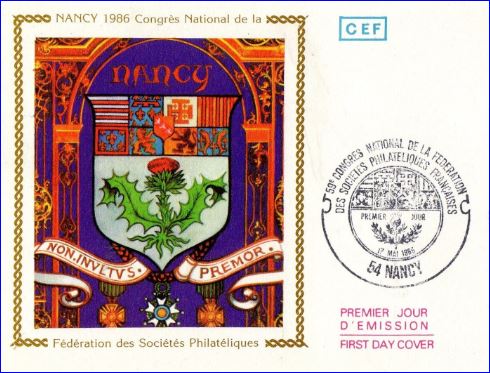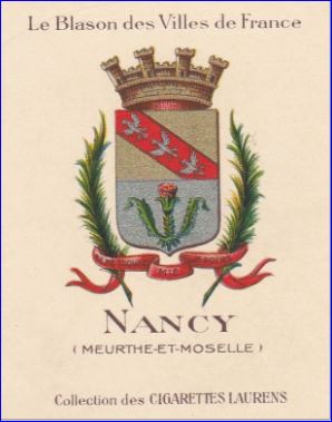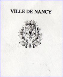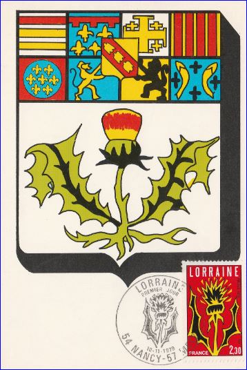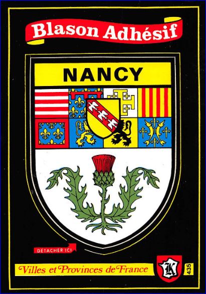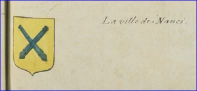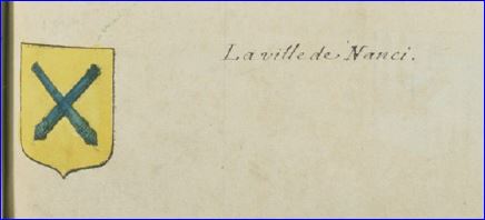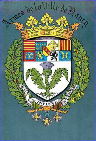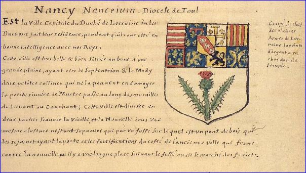 (1575) D'argent au chardon de pourpre tigé arraché et feuillé de deux pièces de sinople; au chef aux armes de Lorraine pleines [coupé d'un, parti de trois: au I fascé d'argent et de gueules de huit pièces, au II d'azur semé de fleurs de lis d'or brisé en chef d'un lambel de gueules, au III d'argent à la croix potencée d'or et cantonnée de quatre croisettes du même, au IV d'or à quatre pals de gueules, au V d'azur semé de fleurs de lis d'or, à la bordure de gueules, au VI d'azur au lion contourné d'or à la queue fourchue, armé, lampassé et couronné de gueules, au VII d'or au lion de sable, armé et lampassé de gueules, au VIII d'azur semé de croisettes recroisetées au pied fiché d'or, à deux bars adossés du même brochants, sur le tout d'or à la bande de gueules chargée de trois alérions d'argent].