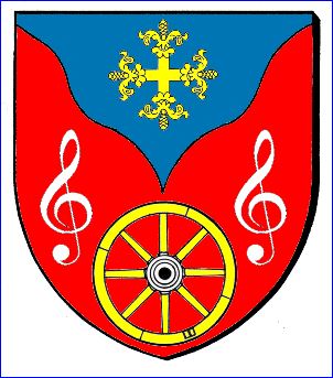 (2018) De gueules à la roue de char celte d'or, le moyeu d’argent, accostée de deux clés de sol d'argent; au chef triangulaire, ondé et cousu d'azur, chargé d'une croisette fleuronnée d'or.