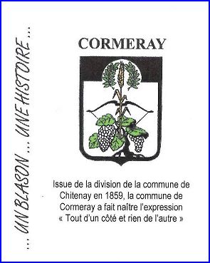 (1990) D'argent au chef échancré d'une pièce de sable ; au cep de vigne du même mouvant de la pointe, pampré de cinq pièces de sinople 2 et 3, et fruité de deux grappes de sable, celle de dextre plus grosse; à l'arc bandé couché de sable brochant sur le cep ; à l'épi de blé ajusté, tigé et feuillé de quatre pièces d'or, accosté de deux rinceaux arrondis de cormier de sinople dans l'échancrure du chef; à la filière de sable.