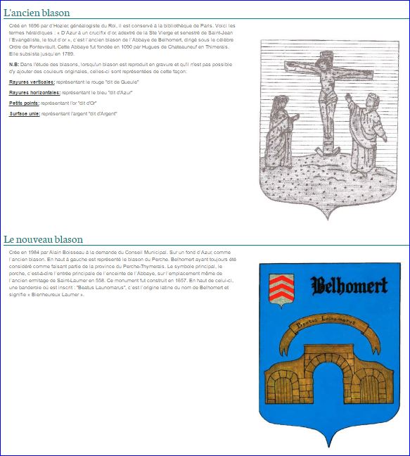 (1984) D'azur au porche de l'abbaye du lieu d'or, ouvert du champ, surmonté d'une banderole d'or chargée de l'inscription «Beatus Launomatus» en lettres de sable, accompagné en chef dextre d'un écusson d'argent à trois chevrons de gueules et en chef senestre de l'inscription «Belhomert» en lettres gothiques d'or.