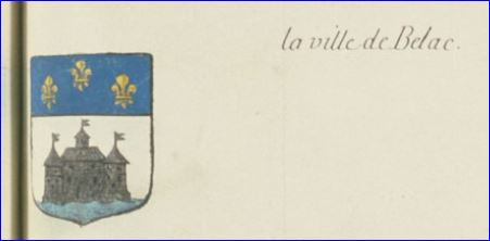 D'argent au château d'or, maçonné de sable, couvert d'une toiture en dos d'âne du même, flanqué de deux tours et donjonné d'une autre tour d'or, couvertes de sable et pavillonnées du champ, le tout sur une mer d'azur; au chef d'azur chargé de trois fleurs de lis d'or mal ordonnées.