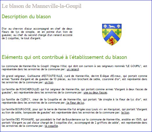 (2003) D'or au chevron d'azur accompagné en chef de deux fleurs de lis de sinople et en pointe d'un lion de gueules; au chef d'azur chargé d'un renard d'argent accosté de deux coquilles du même.
