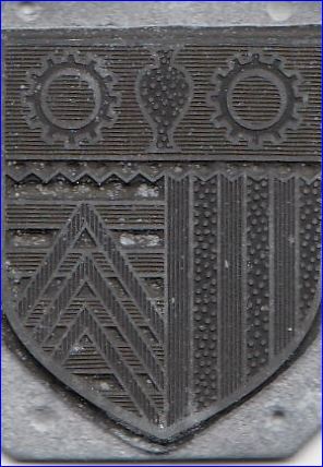 (1957) Parti: au 1er palé d'or et de gueules, au 2e burelé d'argent et d'azur, à trois chevrons de gueules brochant, le 1er écimé; le tout surmonte d'un chef d'azur soutenu d'une divise dentée en pointe d'argent et chargé d'un vase d'or accosté de deux roues dentées d'argent.
