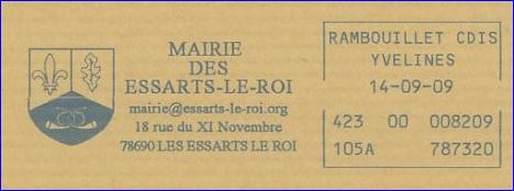 (1984) Tiercé en pairle renversé: au 1er d'azur à la fleur de lis d'or, au 2e de sinople à feuille de chêne d'or, au 3e de gueules à deux grêliers d'or entrelacés en pal.