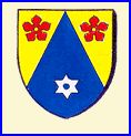 (1994) D'azur à la molette d'éperon d'argent en pointe, chapé d'or chargé de deux quintefeuilles de gueules.