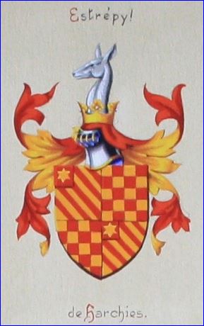 Écartelé: aux 1er et 4e d'or à cinq cotices de gueules et au franc-canton du même chargé d'une étoile d'or, aux 2e et 3e échiqueté d'or et de gueules.