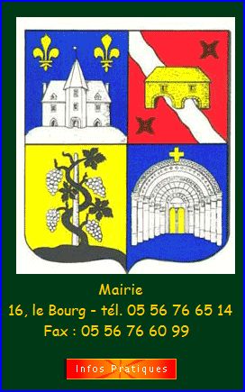 Écartelé : au 1er d'azur au château du lieu d'argent sur une terrasse talutée du même, accompagné en chef de deux fleurs de lis d'or, au 2e de gueules à la bande ondée d'argent accompagnée de deux fers de moulin de sable, au moulin à deux arches d'or brochant en abîme, au 3e d'or au cep terrassé de sable, fruité et tuteuré d'argent, au 4e d'azur au portail d'or dans sept arcades d'argent et à la croisette d'or brochant en chef.