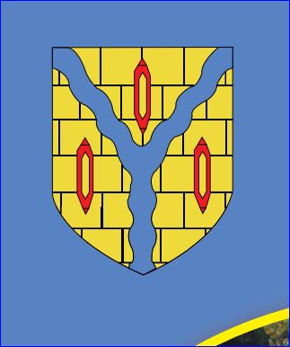 D'or muraillé [maçonné] de sable, au pairle ondé d'azur accompagné de trois navettes de gueules.
