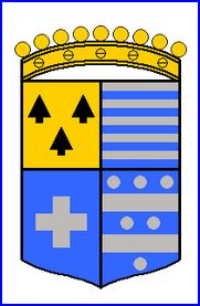Écartelé: au 1er d'or à trois fers de lance [raillards] de sable, au 2e burelé d'argent et d'azur, au 3e d'azur à la croix alésée d'argent, au 4e d'azur à deux fasces d'argent, accompagnées de six besants du même ordonnés 3, 2 et 1.