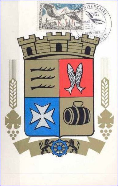(1960) Écartelé: aux 1er d'or à trois demi-ramures de sable posées en fasce, au 2e de gueules à deux bars adossés d'or, au 3e d'azur à la croix de Malte d'argent, au 4e d'or au tonneau couché de sable cerclé du champ.