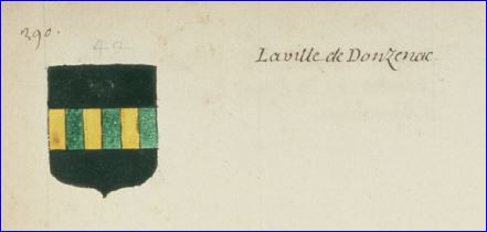 (1988) D'or à la gamade [fauvette à tête noire] contournée au naturel volant en bande, portant dans son bec une brindille de sinople, senestrée en pointe d'un nid du même contenant trois gamadous [oisillons] de sable; au chef d'azur chargé de trois fleurs de lis d'or.