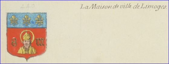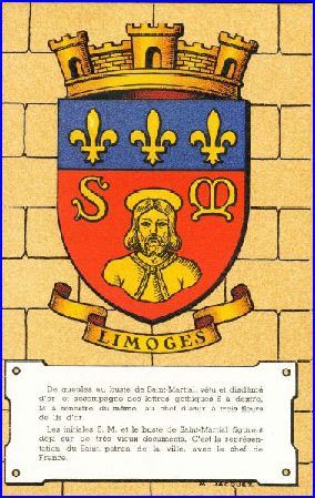 (1421) De gueules au buste de saint Martial d'argent, habillé et nimbé d'or, accosté des lettres onciales, S à dextre, M à senestre, du même; au chef d'azur chargé de trois fleurs de lis d'or.
