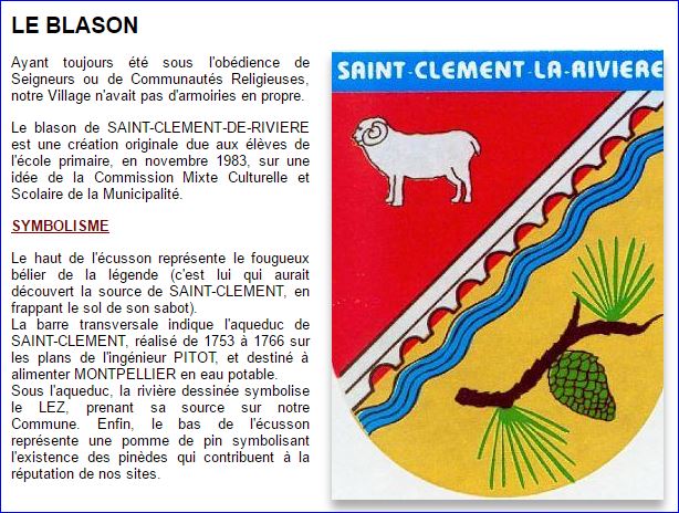 (1983) Taillé: au 1er de gueules au bélier arrêté d'argent, au 2e d'or au rameau de pin au naturel, posé en barre, fruité d'une pomme de sinople en bande et feuillé de deux faisceaux d'aiguilles aussi au naturel, celui de dextre vers la pointe et celui de senestre vers le chef; à l'aqueduc de dix arches d'argent en barre brochant sur la partition et soutenu d'une rivière courante en cotice en barre ondée d'azur.