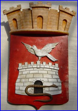 D'azur à la tour d'argent, maçonnée et ouverte de sable, sommée d'une colombe essorante d'argent, et à la guivre contournée en forme de S d'or brochant en pointe.