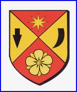 Écartelé en sautoir: au 1er de gueules à l'étoile de huit rais d'or, au 2e d'or au fer de lance versé de sable, au 3e d'or au couteau de sable versé en pal, au 4e de gueules à la rose d'or.