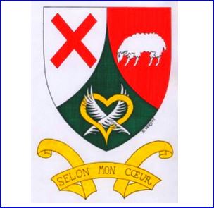 (2005) De sinople à deux palmes d'argent passées en sautoir et entrelacées avec un coeur vidé d'or; chapé ployé à dextre d'argent au flanchis de gueules et à senestre de gueules au mouton paissant d'argent.