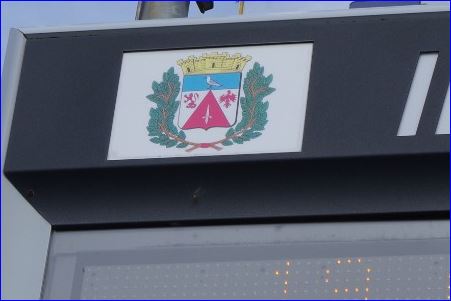 (1997) De gueules à l'épée haute d'argent; chapé du même, chargé d'un lion à dextre et d'un alérion à senestre, le tout de gueules; au chef d'azur chargé d'un goéland au naturel.