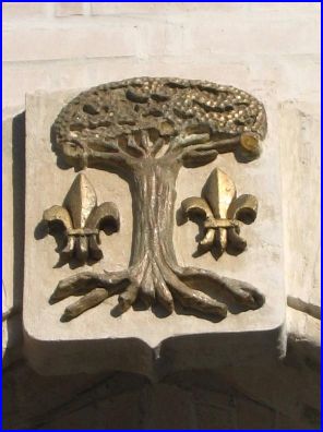 La commune a pu modifier les armes de la famille pour les adapter au nom du lieu (abandon du chef, ajout des fleurs de lis et évolution de l'arbre).