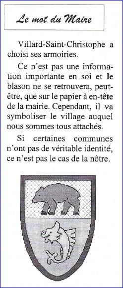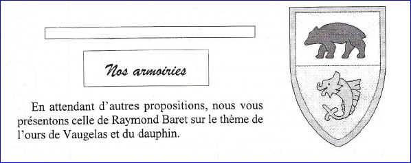 (1996) Coupé: au 1er de sinople à l'ours passant de tenné, au 2e d'or au dauphin d'azur barbé, crêté, oreillé, lorré et peautré de gueules.