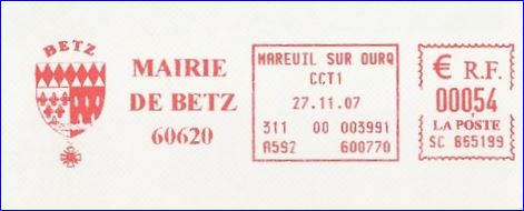 (1972) Parti: au 1er de gueules à six fleurs de lis d'or ordonnées 3, 2 et 1, au 2e de sinople à cinq épis de blé d'or ordonnés 3 et 2, à divise ondée d'argent brochant en pointe; le tout sommé d'un chef fuselé d'argent et de gueules.