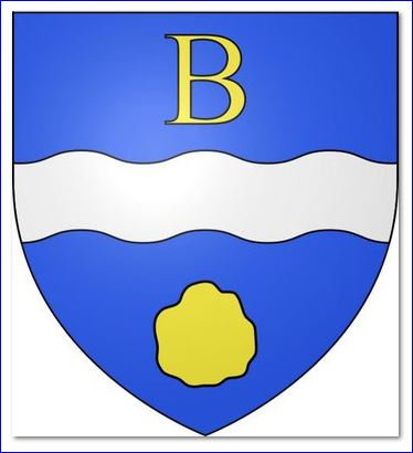 D'azur à la fasce ondée d'argent surmontée de la lettre capitale B d'or et soutenue d'un caillou du même.