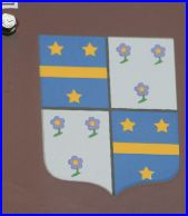 Écartelé: aux 1er et 4e d'azur à la fasce d'or accompagnée de trois étoiles du même, aux 2e et 3e d'argent à trois fleurs à cinq pétales de pourpre, boutonnées d'or, tigées et feuillées de sinople.