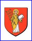 De gueules à saint Laurent de carnation, nimbé d'or, vêtu d'argent et d'or, tenant dans sa dextre un gril du même posé en bande, le manche vers la pointe et dans sa senestre un livre fermé d'argent.